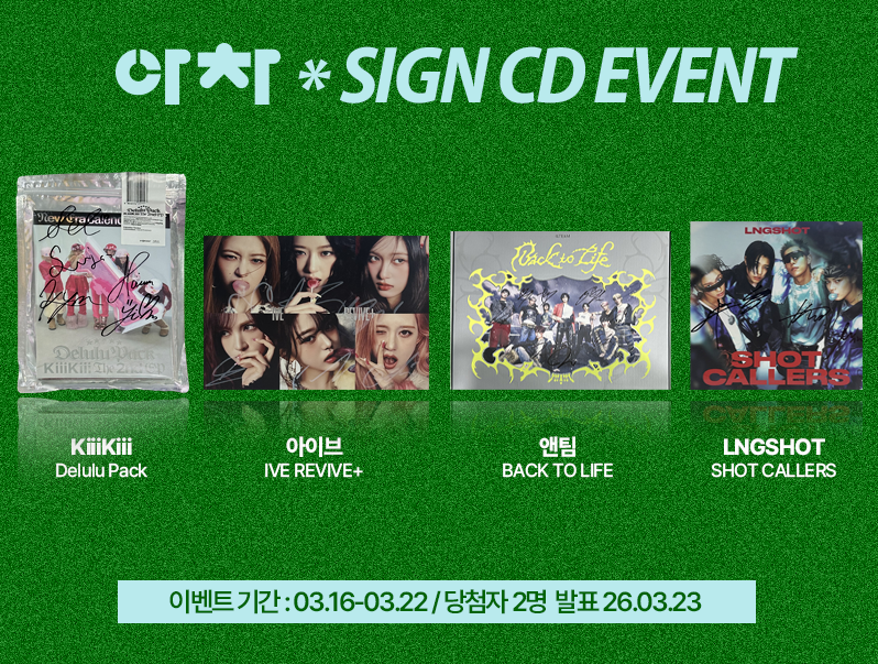 안녕하세요 아이돌차트입니다! 아이돌차트 싸인CD EVENT가 3월 16일부터 시작됩니다. 이벤트 참여는 LP(1회/5LP)로 응모가능하며, 최다응모자 2명이 이벤트 당첨자가 됩니다. 1위 최다응모자는 받고 싶은 싸인 CD 2장을 선택하실 수 있으며 2위 최다응모자는 랜덤으로 싸인CD 2장을 받으실 수 있습니다.  많은 응모 부탁드립니다. 이벤트 기간 : 2026년 3월 16일(월)~2026년 3월 22일(일 23:59:59) 당첨자 발표 : 2026년 3월 23일(월) 당첨 인원 : 최다 응모자 2명 [주의사항] 1. 당첨자 발표는 아이돌차트 공지사항을 통해 안내 드릴 예정이며, 확인을 못하시는 분들을 위해 당첨된 분들의 메일을 통해 당첨 메일을 보낼 예정이니 당첨일에 메일을 꼭 확인해주시고 기한내에 회신 부탁드립니다! 2. 당첨자로 선정되신 분들께서는 본인 확인 및 선물 배송을 위해 개인 정보를 추후 메일로 보내주셔야하며, 기한이 지나면 선물 증정이 어려우니 꼭 늦지 않게 메일을 보내주시기 바랍니다. 3. 해외거주자분들도 응모가 가능하며, 당첨시 거주 국가로 경품을 발송해 드립니다. 단, 이 경우 한국에서의 우편 발송이 제한된 국가는 발송이 불가하며 배송비는 당첨자가 부담합니다. (Overseas residents can apply. If you win, we will send the prize to your country of residence. However, it is not possible to ship to countries where mail delivery is restricted in Korea. Also, the delivery fee will be paid by the winner.) 4. 당첨된 경품은 영리취득을 목적으로 사용하는 것을 엄격히 금하고 있습니다. 또, 경품의 수령 이후에는 모든 법적인 책임은 전적으로 당첨자에게 있습니다. 영리취득 및 부정한 용도로 사용하여 발생하는 법적인 문제에 대해 아이돌차트는 일체 책임이 없음을 알립니다.